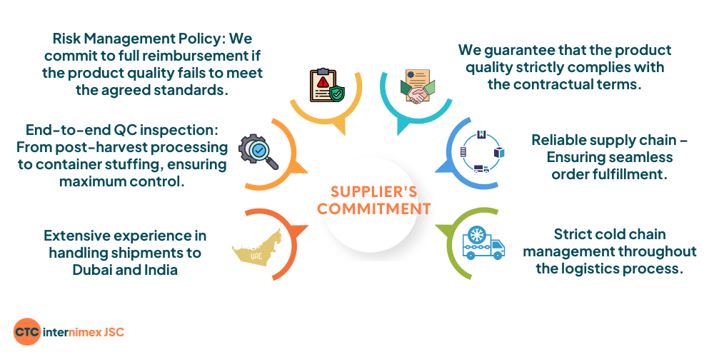 Quality control is a critical factor in successful Cavendish banana export to Dubai. Our production process is strictly managed from plantation to container loading, ensuring stable quality for every shipment.